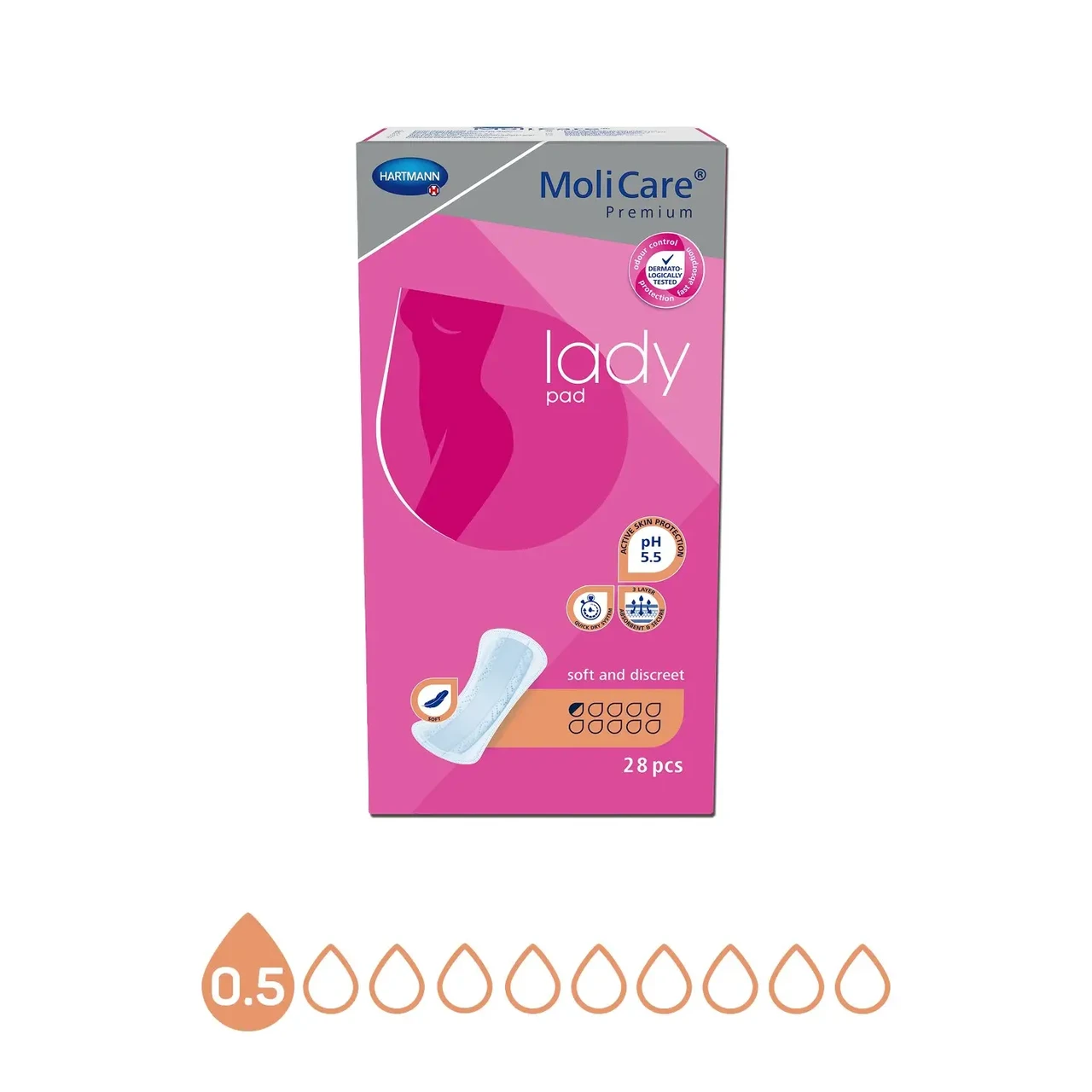 Прокладки для нетримання MoliCare® Premium lady pad призначені для жінок з незначним витоком сечі. Вони так само зручні, як і менструальні прокладки, але на відміну від останніх мають у 5 разів вищу всмоктуючу здатність, а також вбирають запах. Це забезпечує відчуття свіжості на весь день. Сеча всмоктується дуже швидко і розподіляється по всій подушечці, прокладки не дають їй проникнути назад через поверхню подушечки.